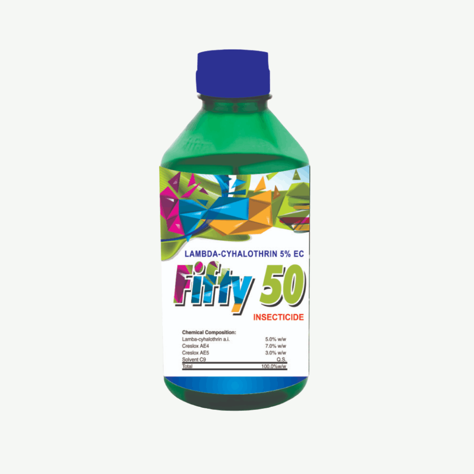 FIFTY-50 contains Lambda-Cyhalothrin 5% EC and is effective against a broad range of insect pests at all stages of development. It is widely used in cotton, rice, brinjal and vegetables for reliable pest control.