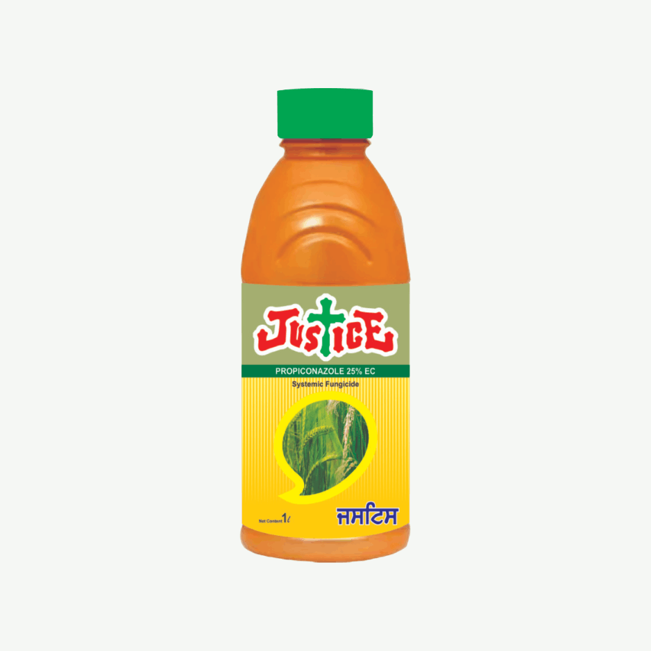 JUSTICE (Propiconazole 25% EC) is a systemic fungicide effective against pre and post infection stages of fungal diseases. It is used in paddy for sheath blight and in wheat for Karnal bunt, ensuring better disease control and crop yield.
